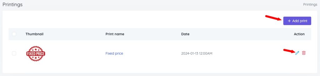 - Click the Add print button or edit if you want apply to a printing type.