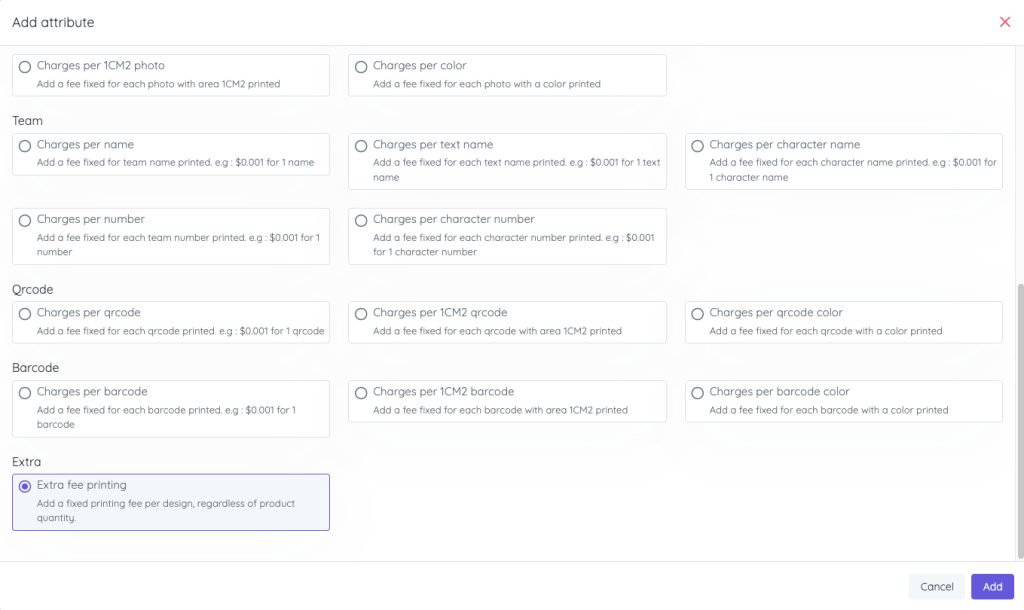 This addon allows you to add a fixed printing fee per design, regardless of product quantity. You can be applied to all printing type and combined to other printing attributes..