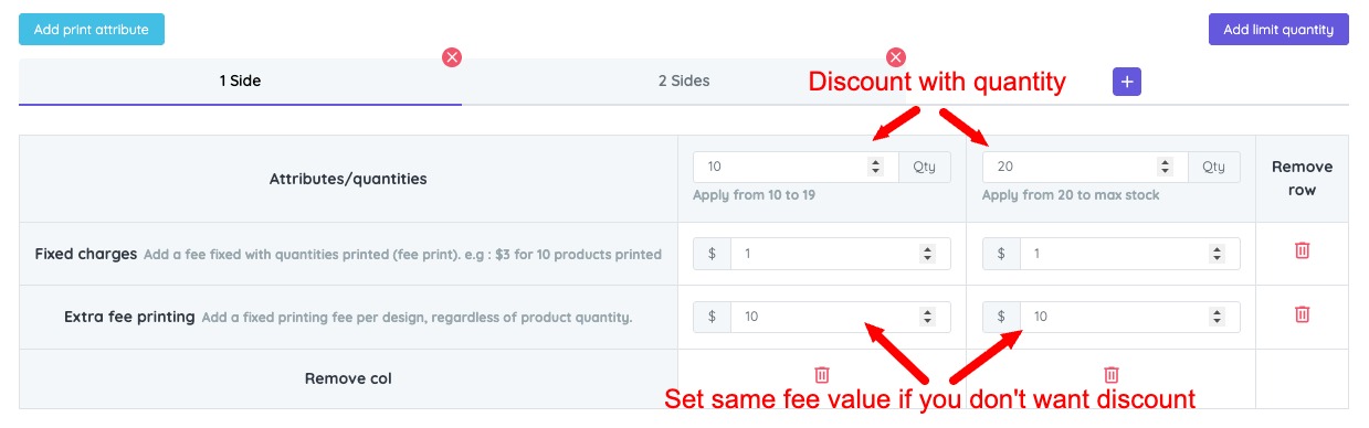 Note: If you do not want the printing fee to decrease based on quantity (for example, the fee is $10 for 10 products but drops to $8 for 20 products), you need to set the same price for all quantity levels.